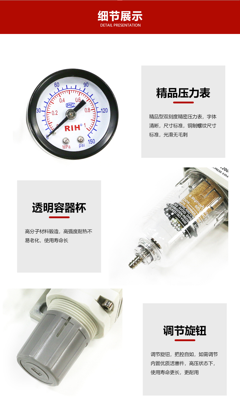 SMC型調(diào)壓過濾器AW2000-02,結(jié)構(gòu)輕型緊湊,安裝使用方便,壓入式自鎖機(jī)構(gòu),可防止調(diào)定壓力受外界干擾而產(chǎn)生異動(dòng);壓力損失小,分水效率高;透明視察罩,可直接觀察滴油量大?。蝗鸷嗨a(chǎn)的調(diào)壓過濾器能夠完全代替SMC調(diào)壓過濾器,提供最全面的型號(hào)選型和報(bào)價(jià)銷售服務(wù)。