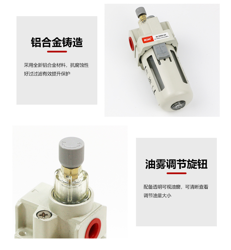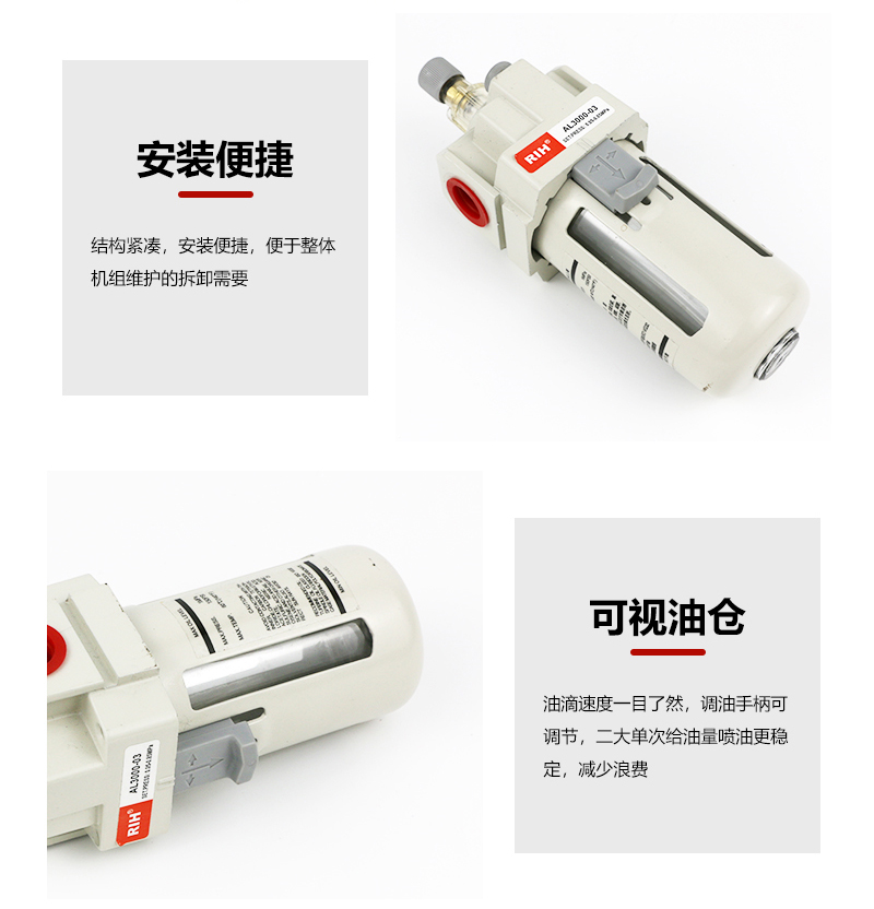 油霧器是一種特殊的注油裝置,它將潤滑油進行霧化,并注入空氣流中,隨壓縮空氣流入需要潤滑的部位,達到潤滑的目的,比如氣缸內(nèi)活塞桿的潤滑,氣批的轉(zhuǎn)動潤滑等。瑞亨所生產(chǎn)的AL3000-03,AL4000-04,AL5000-10能夠完全代替SMC油霧器,提供最全面的油霧器給油器型號選型、價格銷售服務(wù)。